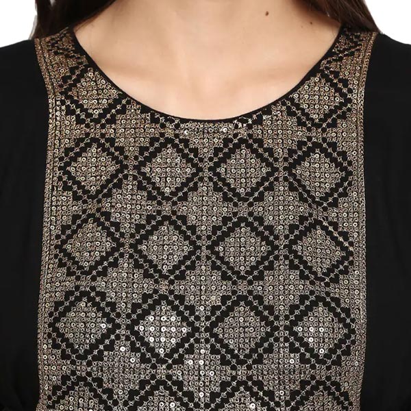 start your day in style wearing this knee length women's kurta, crafted in rayon fabric to give you utmost comfort. features a round neck and 3/4th sleeves. team it up with a matching leggings or palazzos with a statement earrings. model is wearing size s and is 5'7\ in height.